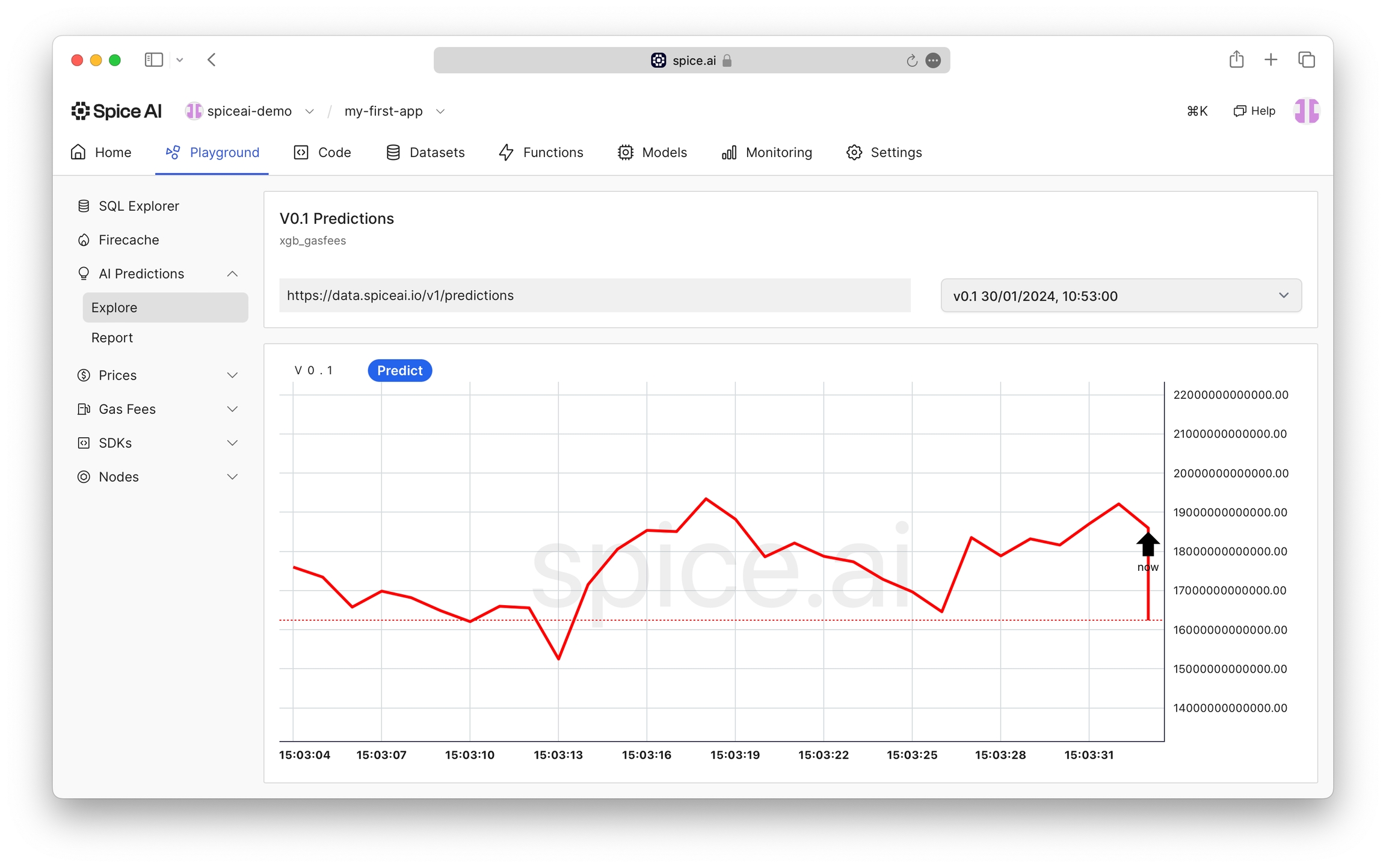 Clicking Predict will demonstrate calling the predictions API using lookback data within the Spice platform. A graph of the predicted value(s) along with the lookback data will be displayed.