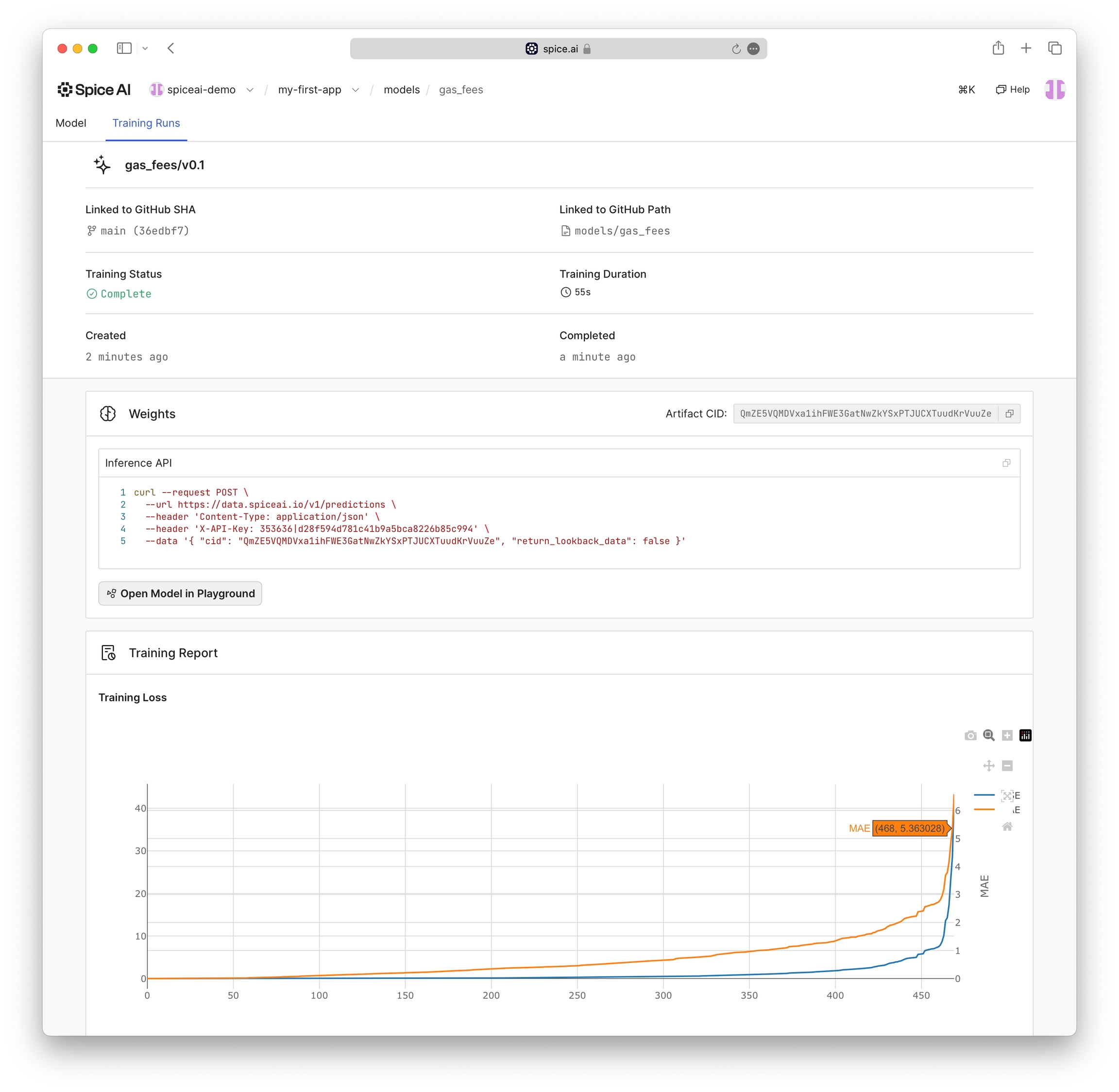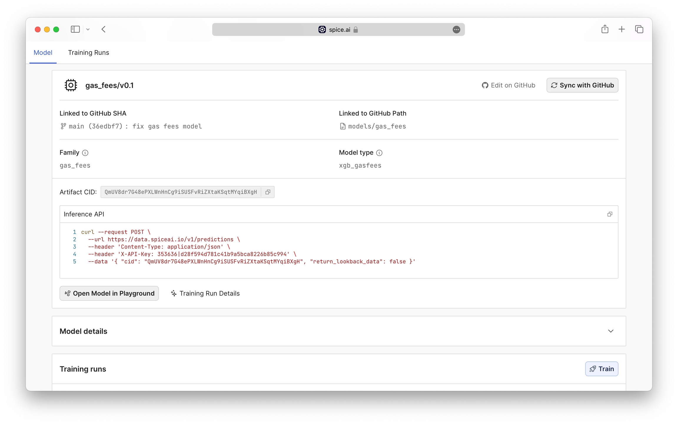 The Training Runs page provides training details including a copyable curl command to make a prediction from the command line.