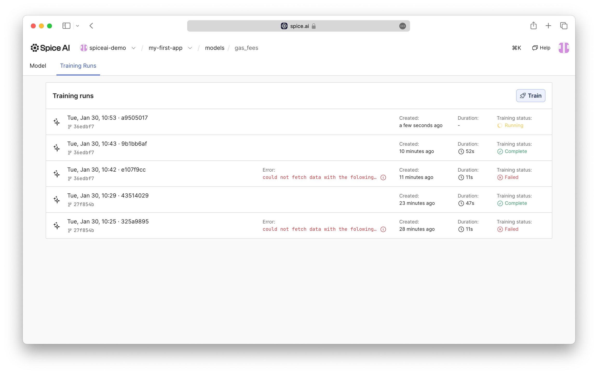 Training runs in progress will be shown and updated, along with historical training runs.