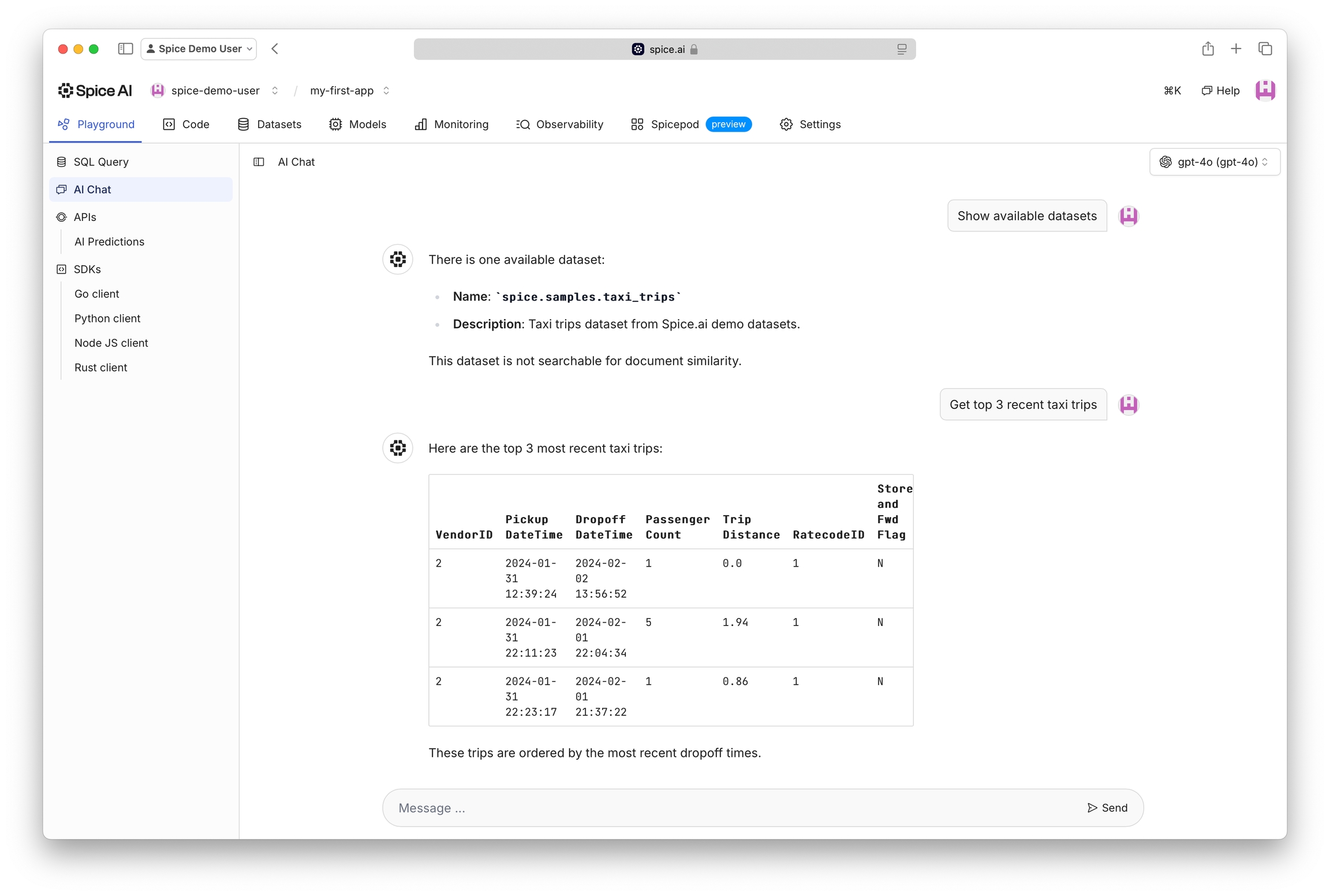 🎉 Congratulations, you've now added an OpenAI model and can use it to ask questions of the NYC Taxi Trips dataset.