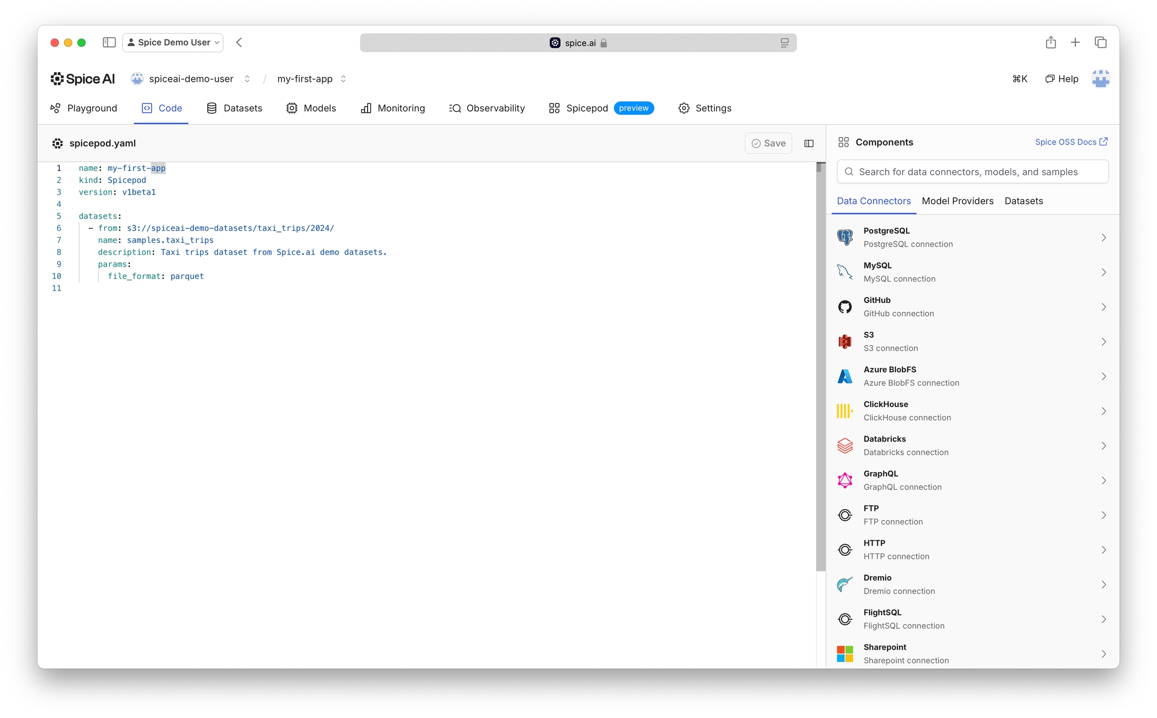To update Spice App spicepod.yaml, navigate to Code tab. Use Components sidebar to add data connectors, model providers and preconfigured datasets, or manually edit spicepod.yaml in code editor.