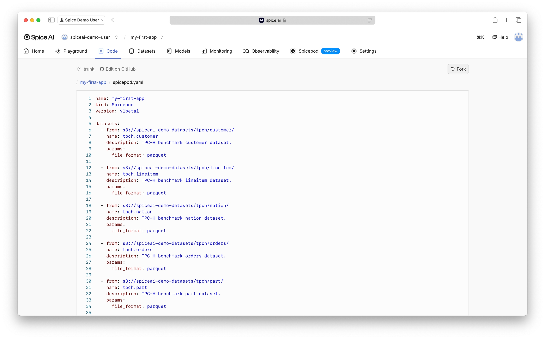 If the Spice App is connected to a GitHub repository (learn more about how to connect), the only way to update the Spicepod configuration is to edit the spicepod.yaml file in the root of your repository and push it to the default branch.