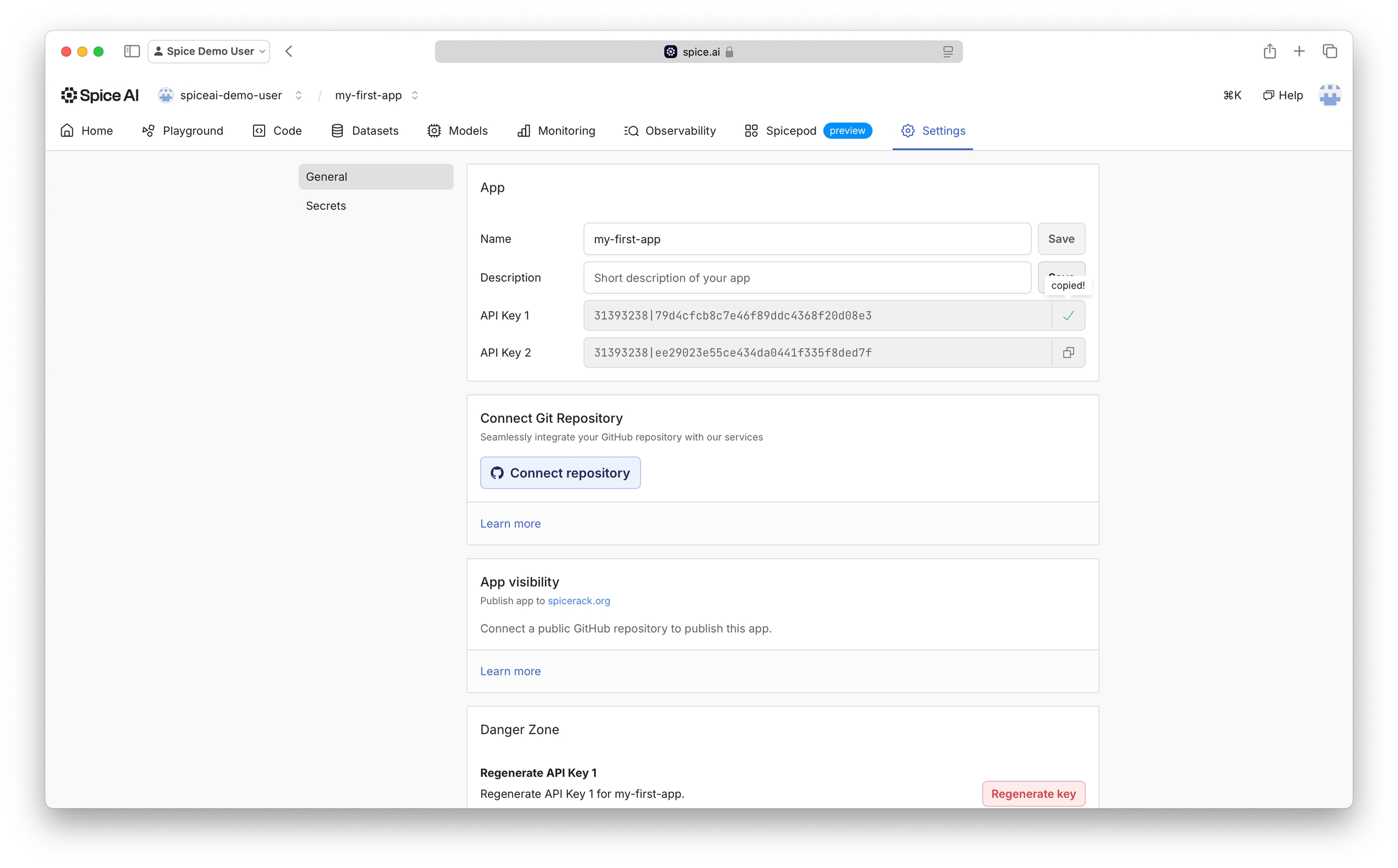 Each Spice app have two pre-generated API keys, which can be used with Spice SDKs, the HTTP API or the Apache Arrow Flight API.