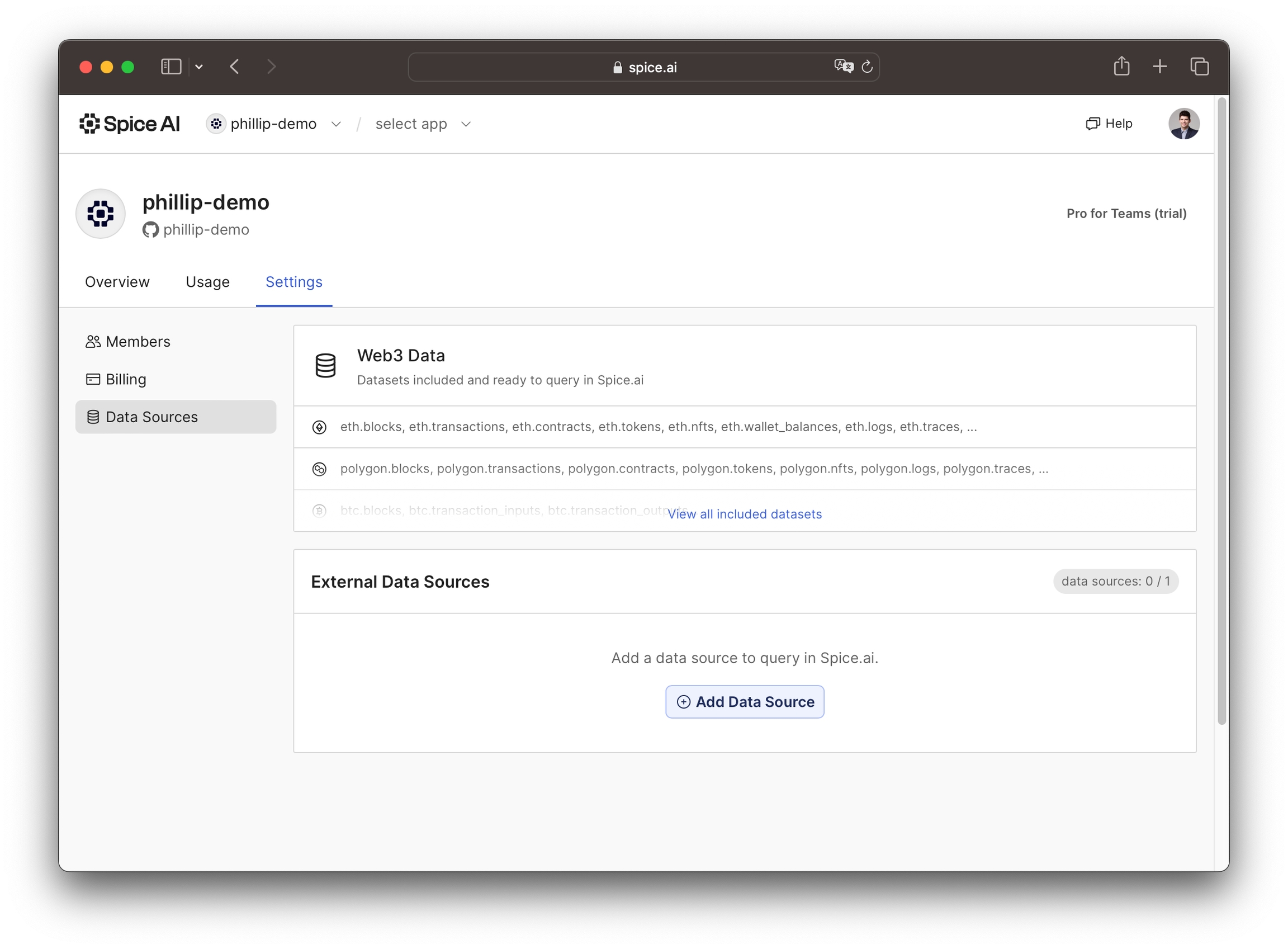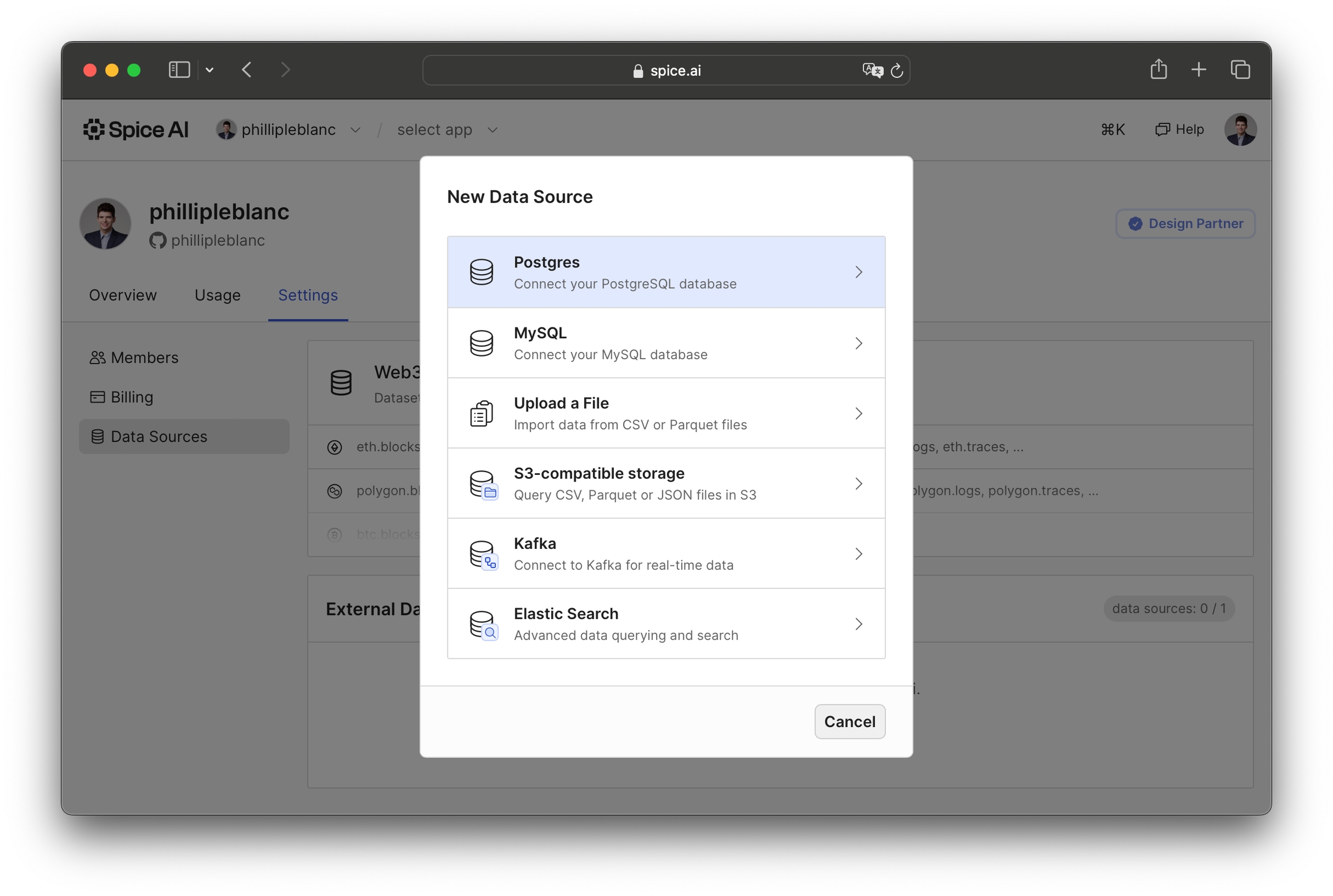 External Data Sources are added and managed through organizations and are available to all Spice applications within the organization. They are private and are not visible or accessible to applications in other organizations.