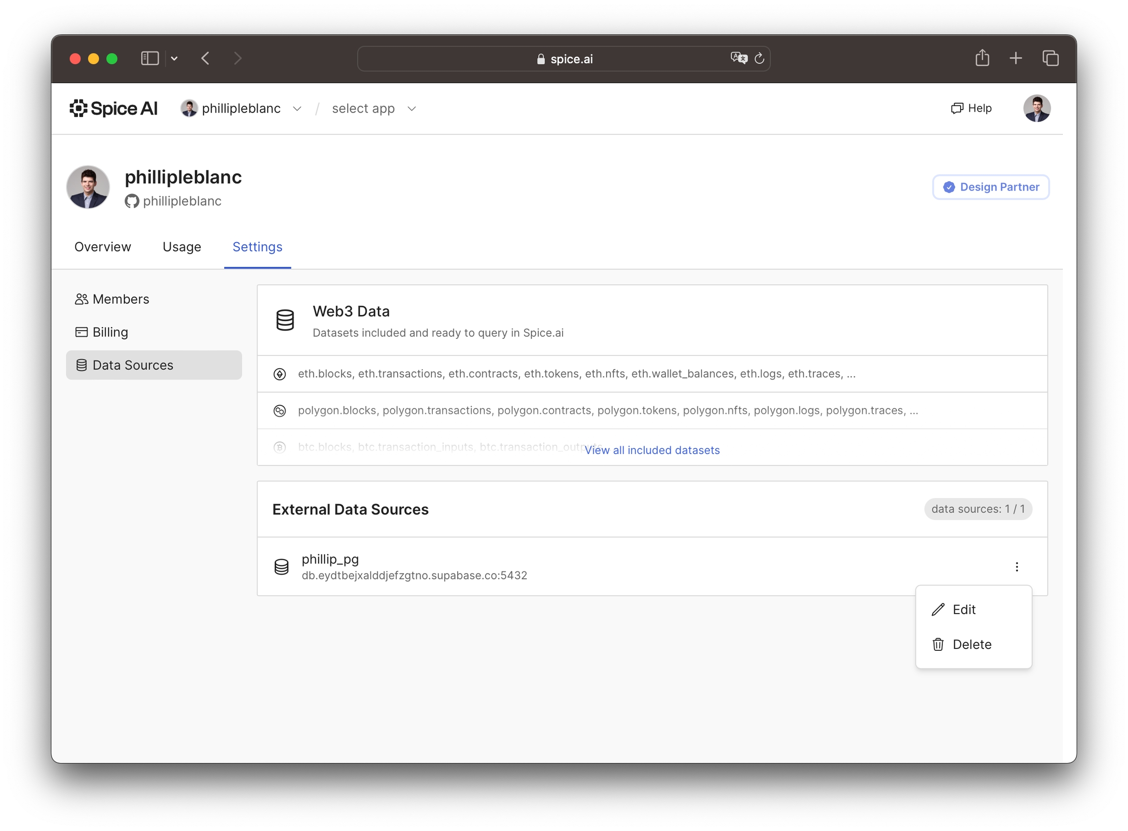 Once the data source is connected the data source will be made available through its name, which will be the schema name for SQL queries. E.g. naming the data source connection "mydb" will enable selecting tables with the SQL SELECT * FROM mydb.{table}., click the vertical dots to the right of the connection to edit or delete it.