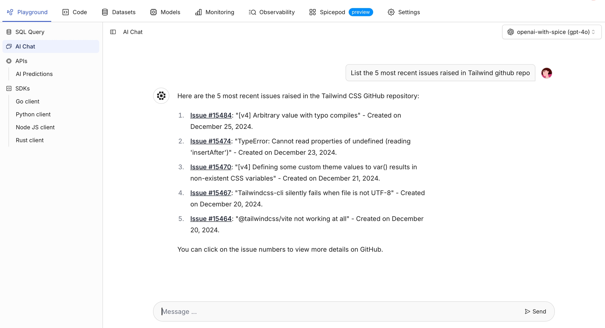 Ask questions regarding datasets configured in spicepod within the AI Chat.