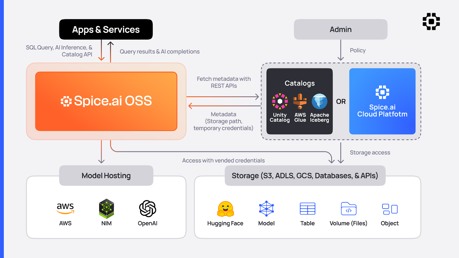 Spice was purpose-built to solve this problem. By unifying SQL query federation and acceleration, search and retrieval, and LLM inference into a single, deploy-anywhere runtime, Spice makes it possible to serve data and AI-powered experiences directly from your existing object storage - securely, at low latency, and without sacrificing the simplicity and economics of object storage. Built in Rust on top of modern open-source technologies like Apache DataFusion (query optimization), Apache Arrow (in-memory processing), DuckDB (fast analytics), Apache Iceberg (open table format), and OpenTelemetry (observability), Spice transforms object storage into a high-performance data layer equipped to serve the most demanding operational workloads.