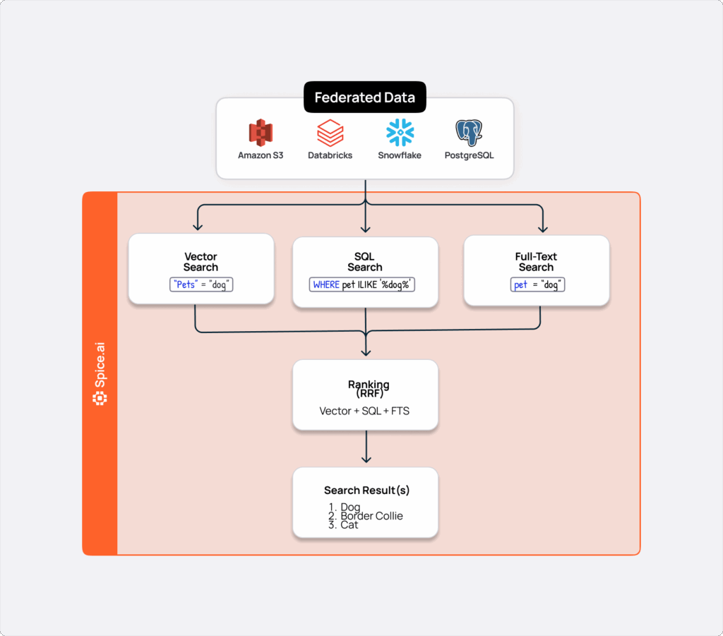 Hybrid Search with RRF in Spice eliminates external ranking servers, sync pipelines, or duplicated datasets; you can query, rank, and reason across disparate data sources from a single SQL interface. Whether you’re powering an internal knowledge assistant or surfacing live content from social feeds, you get near-real-time, context-rich results with minimal overhead.