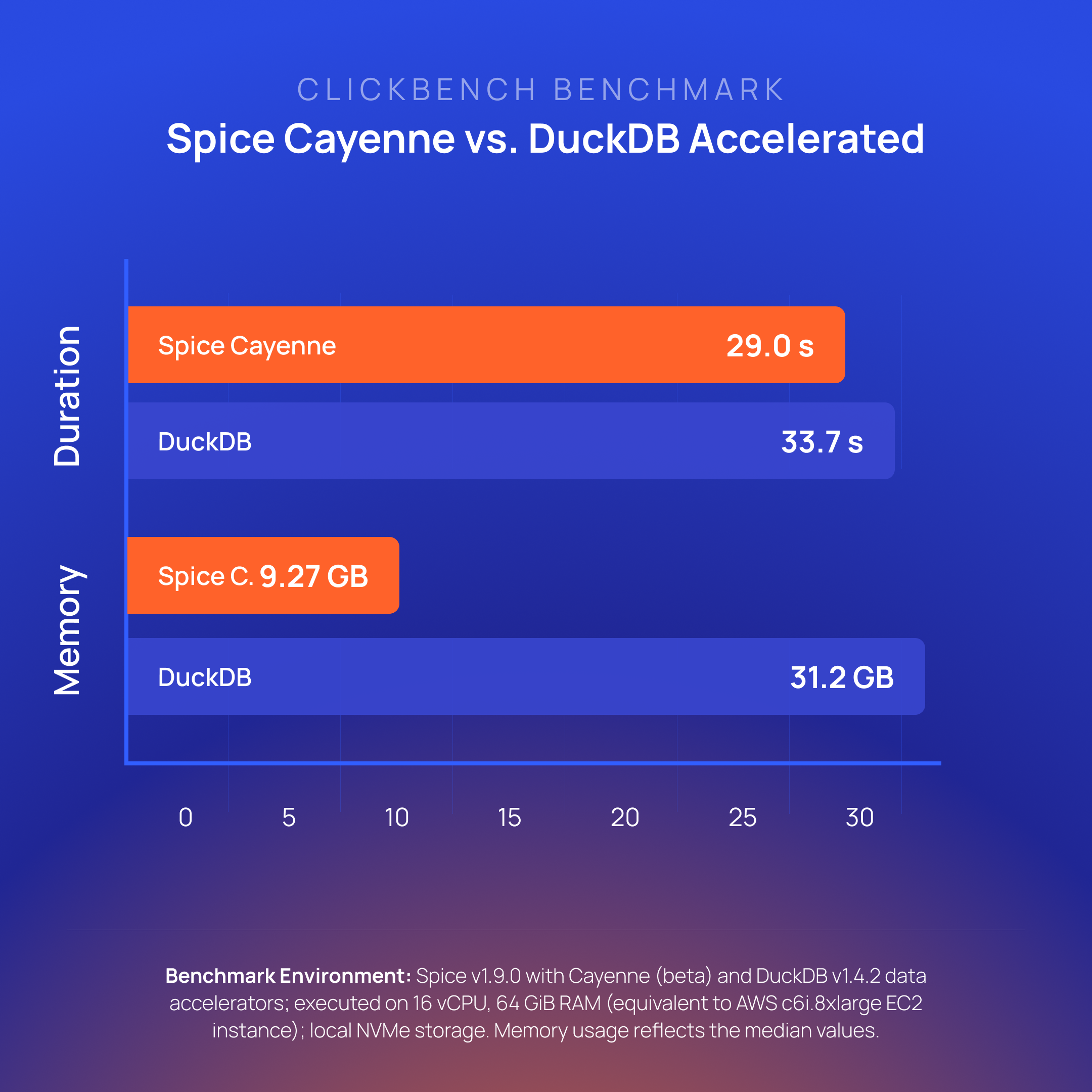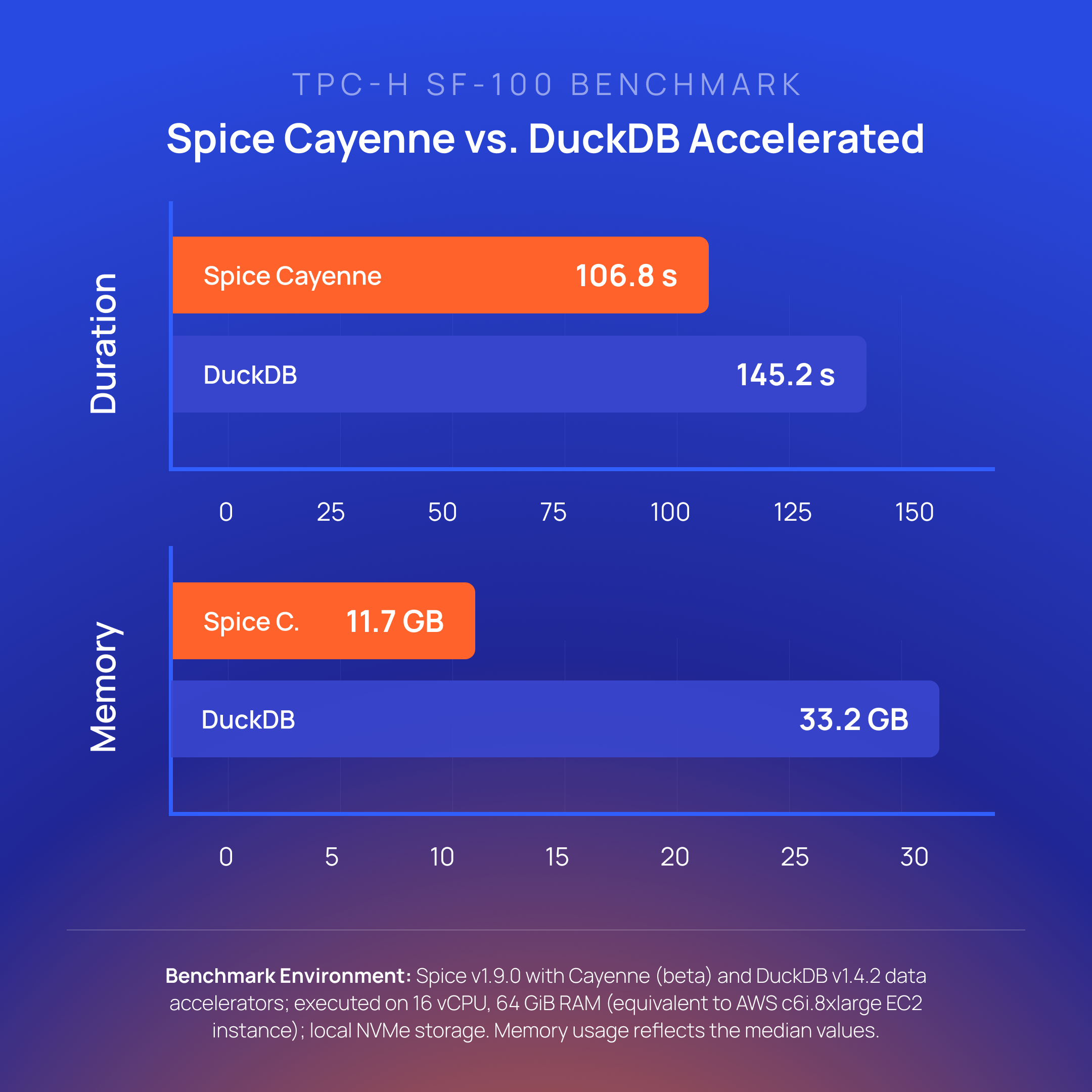 Cayenne is the new premier data accelerator for high-volume, multi-file workloads. Built on the Vortex columnar format from the Linux Foundation, Cayenne offers better ingestion and query performance than DuckDB without single-file scaling limits. Spice Cayenne supports high concurrency, retention policies, and SQL-based lifecycle management.