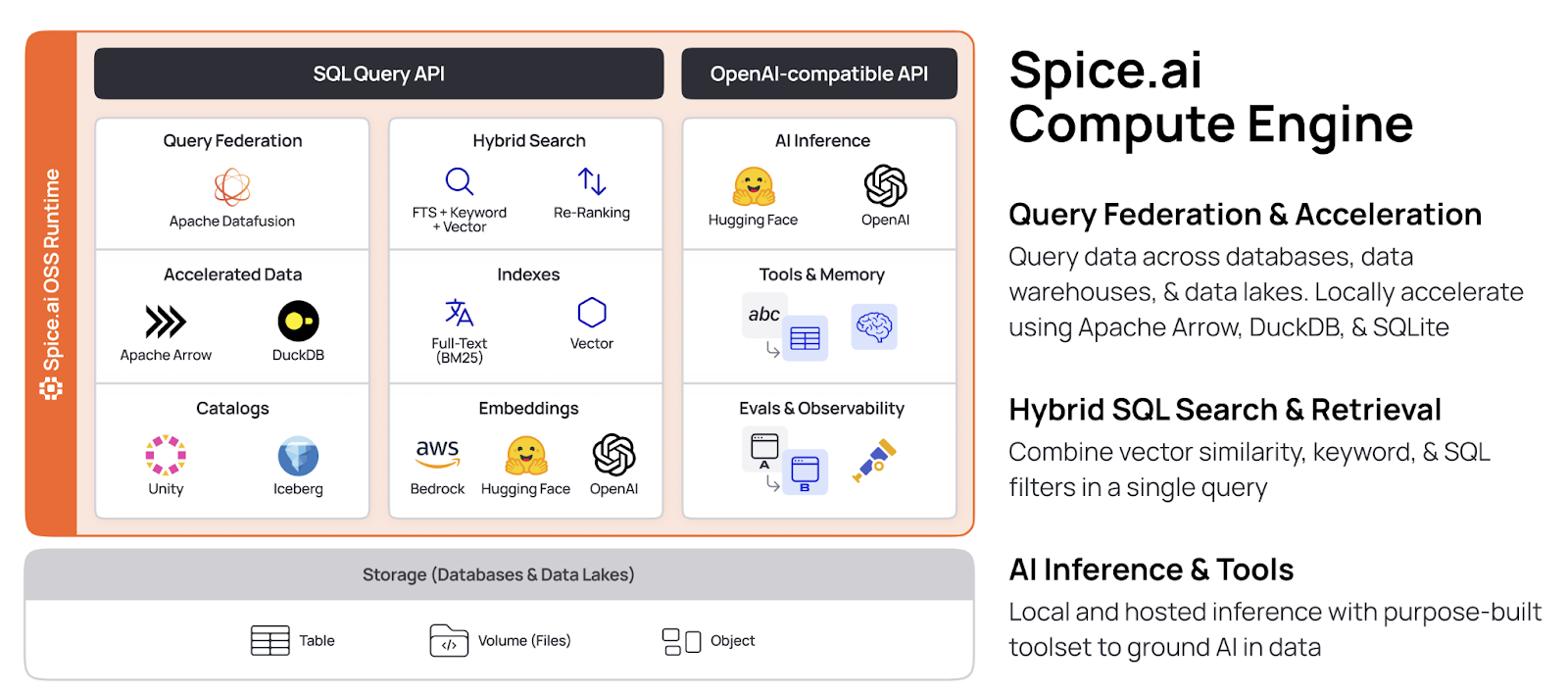 Spice’s lightweight compute engine is designed to integrate directly into your application stack and is built on a fully open-source foundation. It embeds the DataFusion SQL query engine, supports over 35 open-source connectors, and can locally materialize data for acceleration using DuckDB, SQLite, or PostgreSQL.