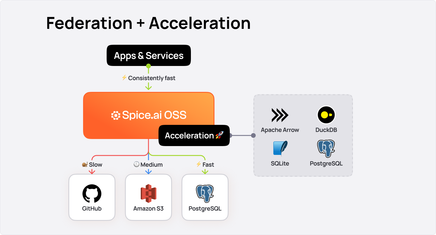 But search alone isn’t enough. Enterprise AI applications also need low latency retrieval across data systems when integrating with LLMs. That’s why Spice pairs its search engine with query federation, acceleration, and AI inference in a single, deploy-anywhere runtime. Instead of moving data, Spice queries it where it resides - across OLTP databases, OLAP warehouses, and object stores like S3 - while accelerating the slowest layers through caching and materialization for sub-second access. This makes it possible to serve data and AI-powered experiences directly from your existing systems - securely, at low latency, and without costly re-engineering.