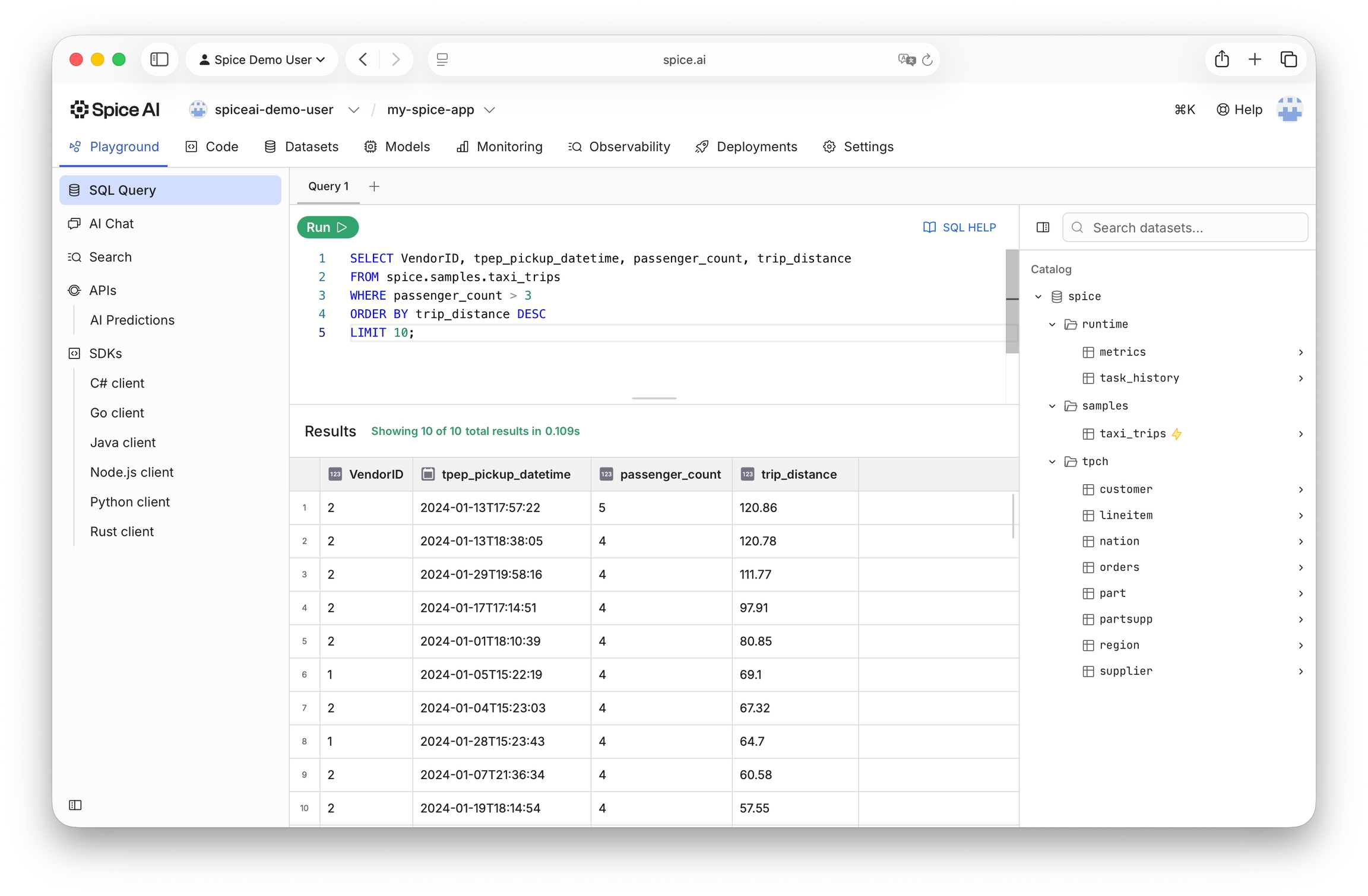 For production applications, leveraging the high-performance Apache Arrow Flight endpoint is recommended. The Spice SDKs always query using Arrow Flight.