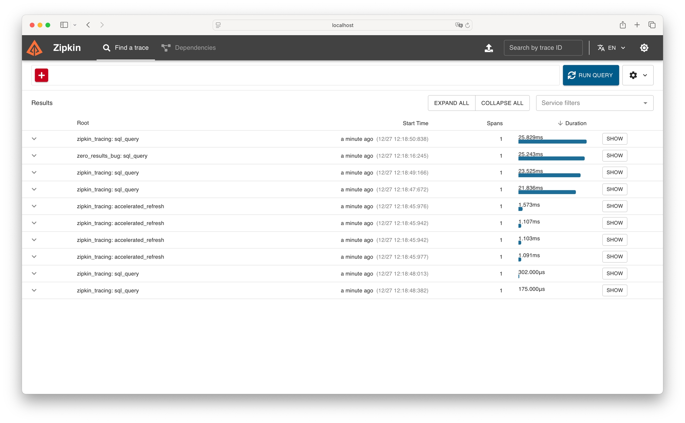 In addition to the built-in runtime.task_history SQL table, Spice can export the observability traces it collects into Zipkin.