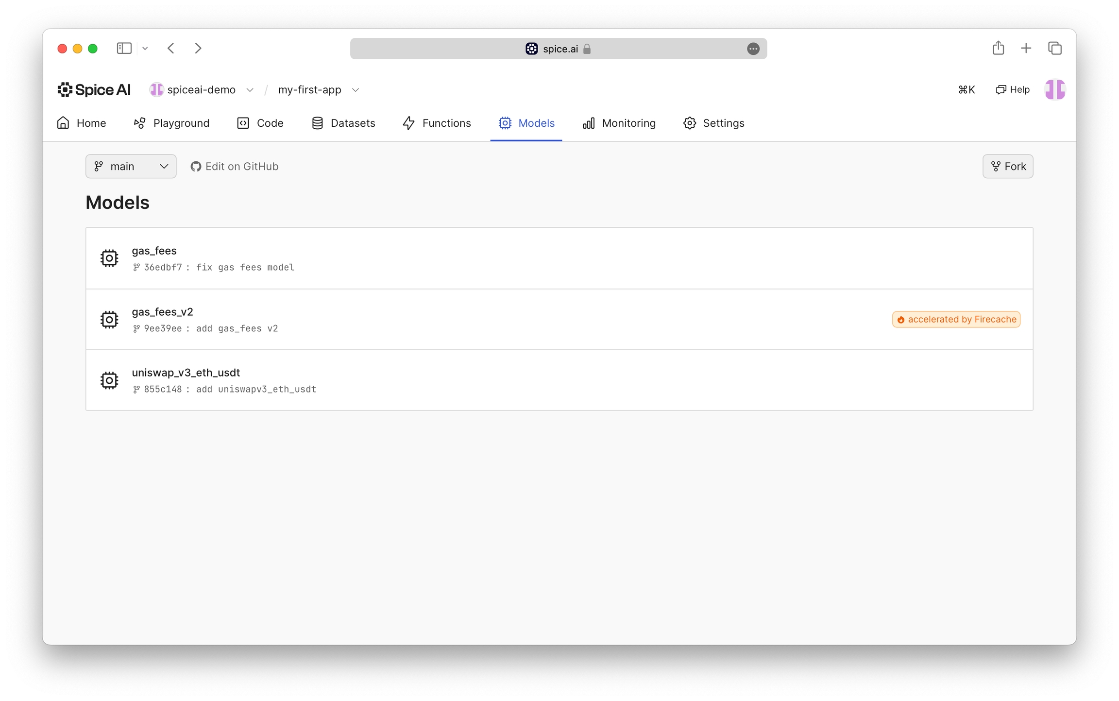 Add a model.yaml file to the repository path /models/[model_name]/model.yaml of a GitHub connected Spice app, replacing [model_name] with the desired model name. For example, the Gas Fees Predictions demo model uses the path /models/gas-fees/model.yaml.