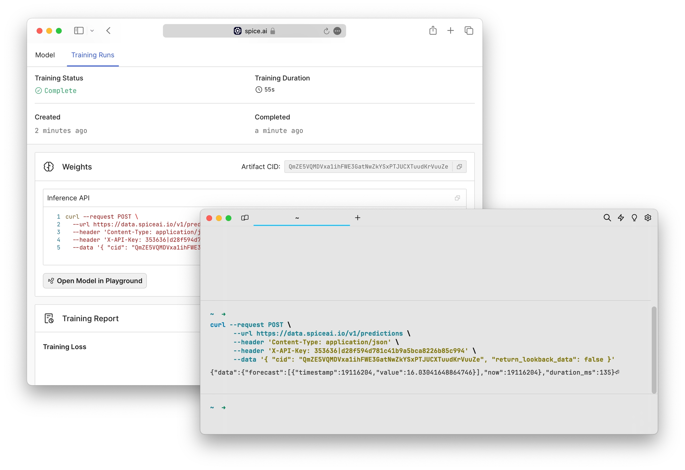 The Training Runs page provides training details including a copyable curl command to make a prediction from the command line.
