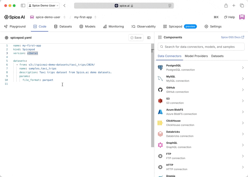 tools: autoin theparamssection of thegpt-4oModel to automatically connect datasets to the model. The final Spicepod configuration in the editor should be as follows: