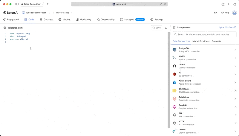 To update Spice App spicepod.yaml, navigate to Code tab. Use Components sidebar to add data connectors, model providers and preconfigured datasets, or manually edit spicepod.yaml in code editor.