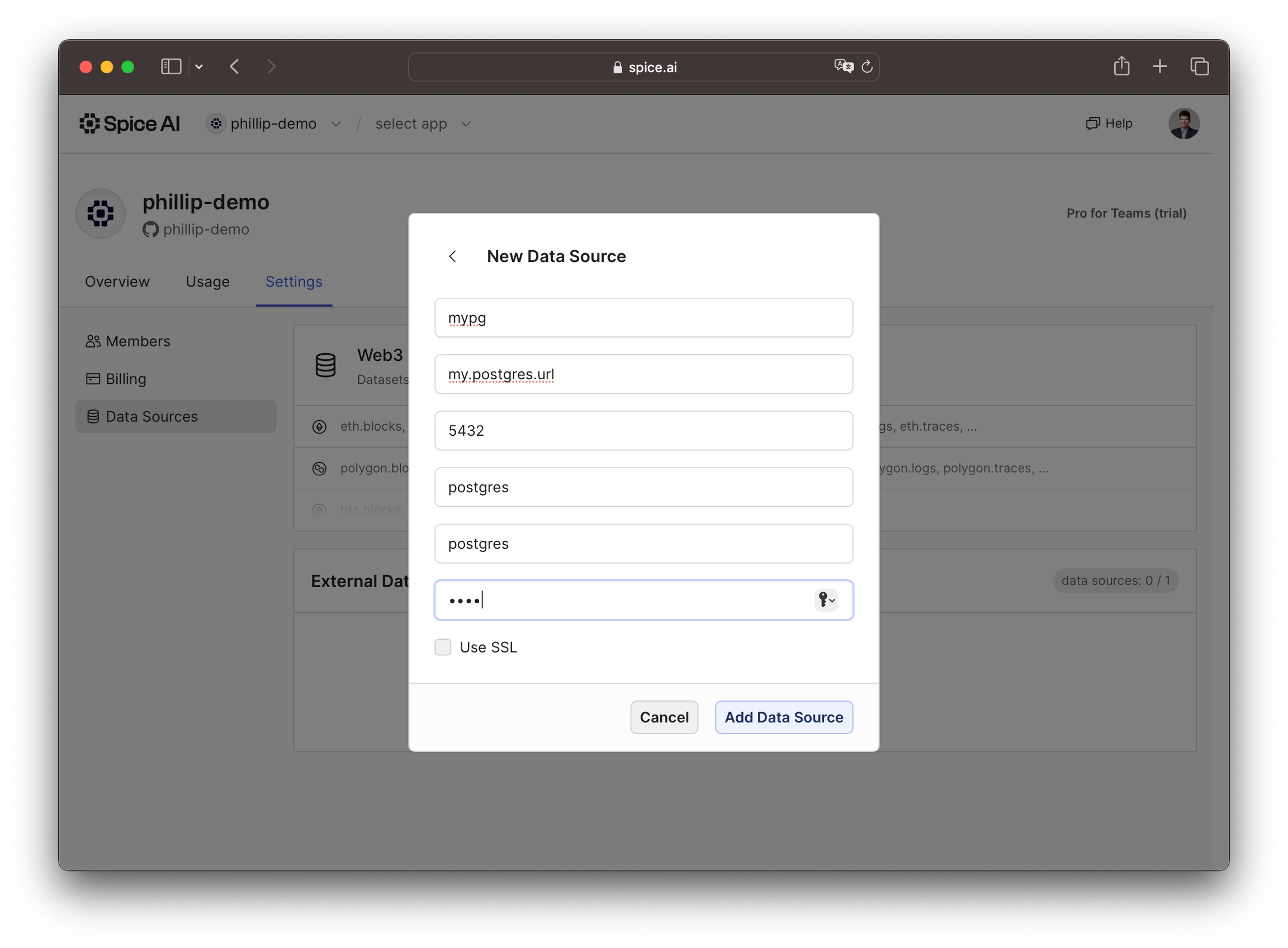 External Data Sources are added and managed through organizations and are available to all Spice applications within the organization. They are private and are not visible or accessible to applications in other organizations.