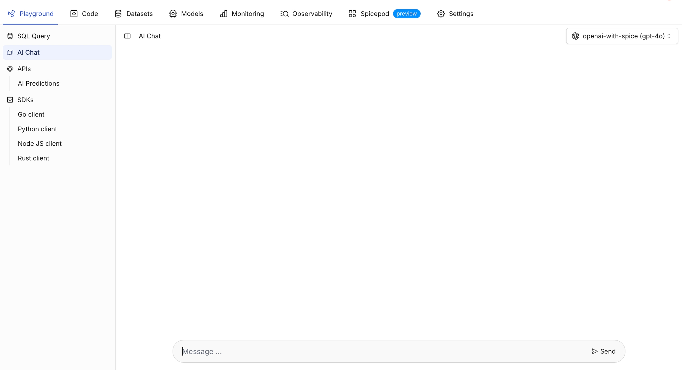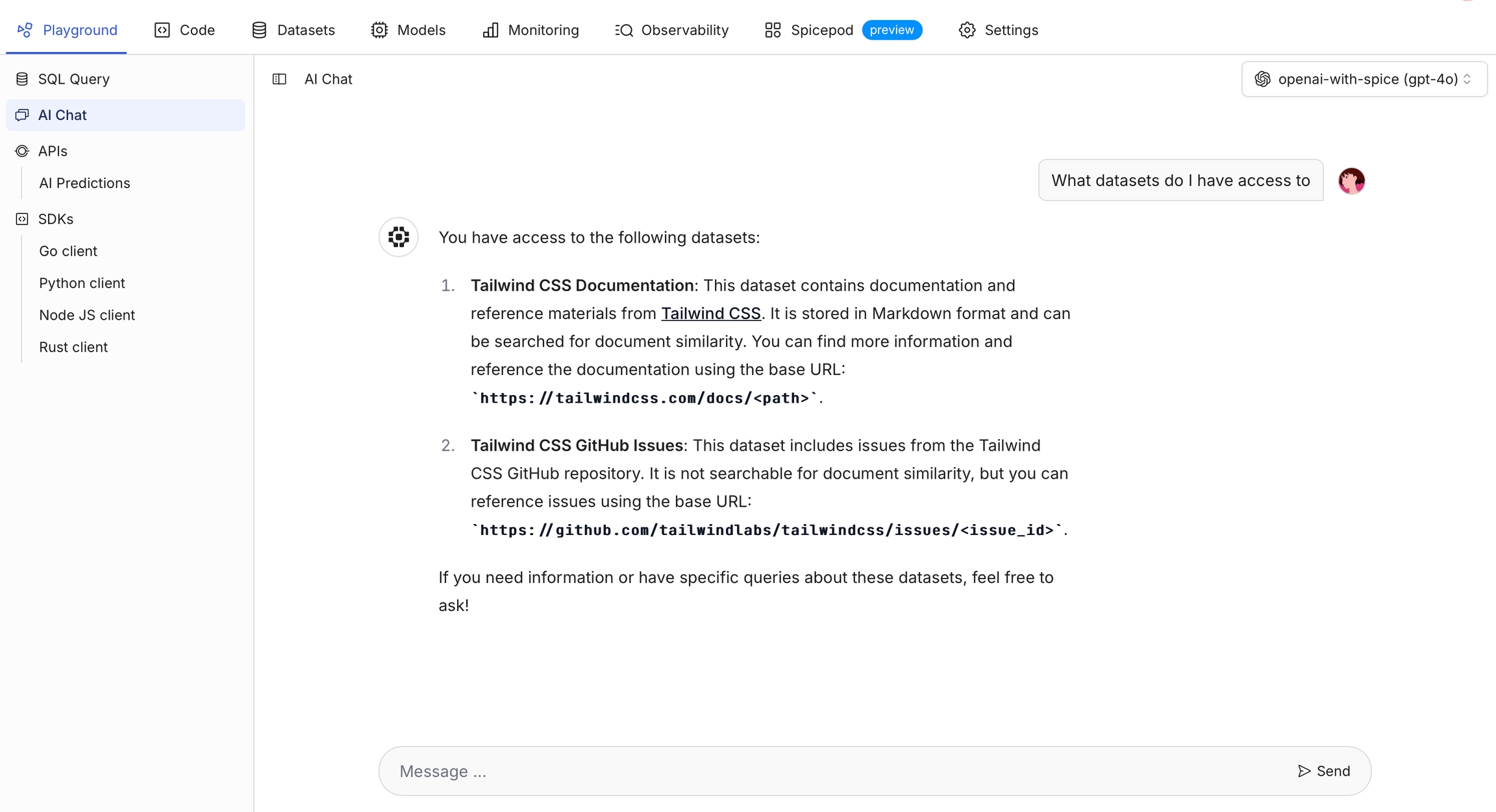Ask questions regarding datasets configured in spicepod within the AI Chat.