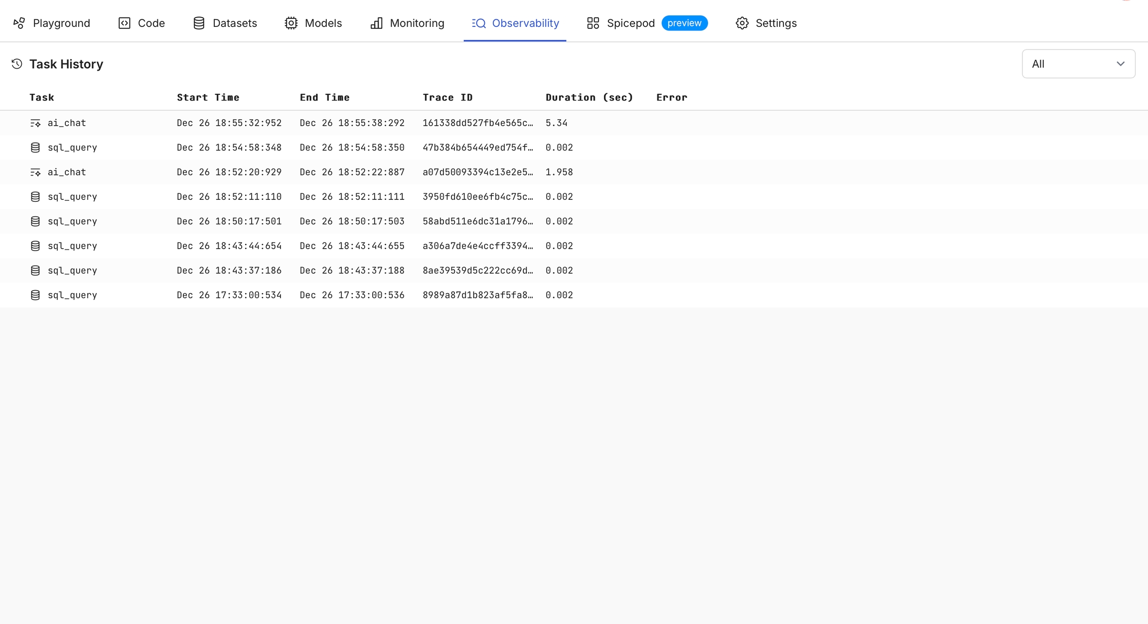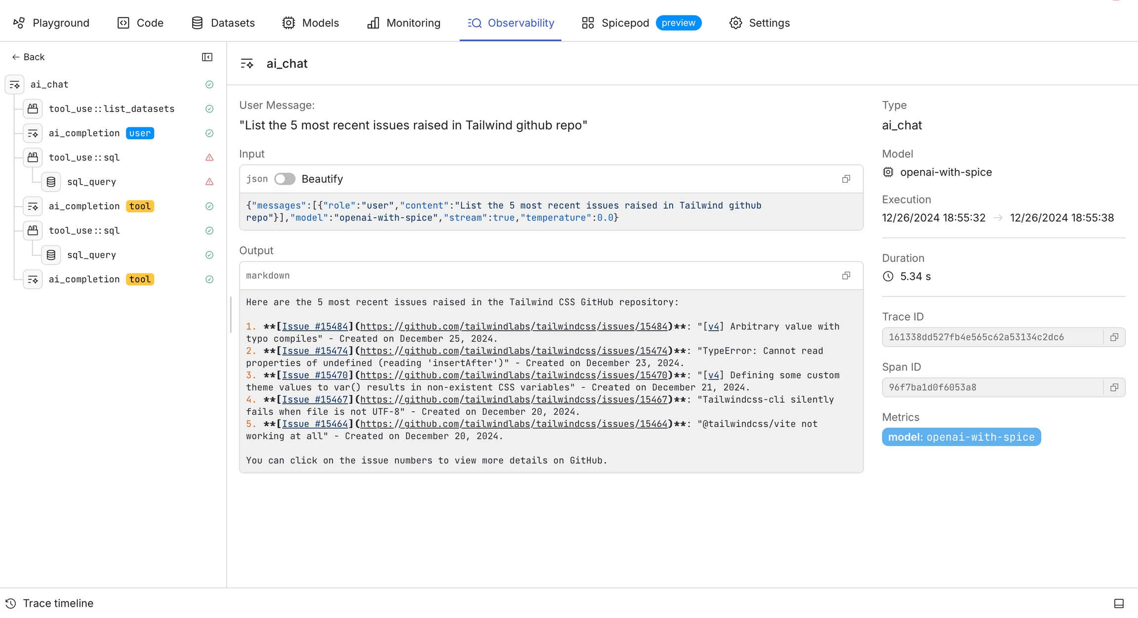 spiceuseai.us provides observability Ito the AI Chat, showing full tool usage traces and chat completion history.