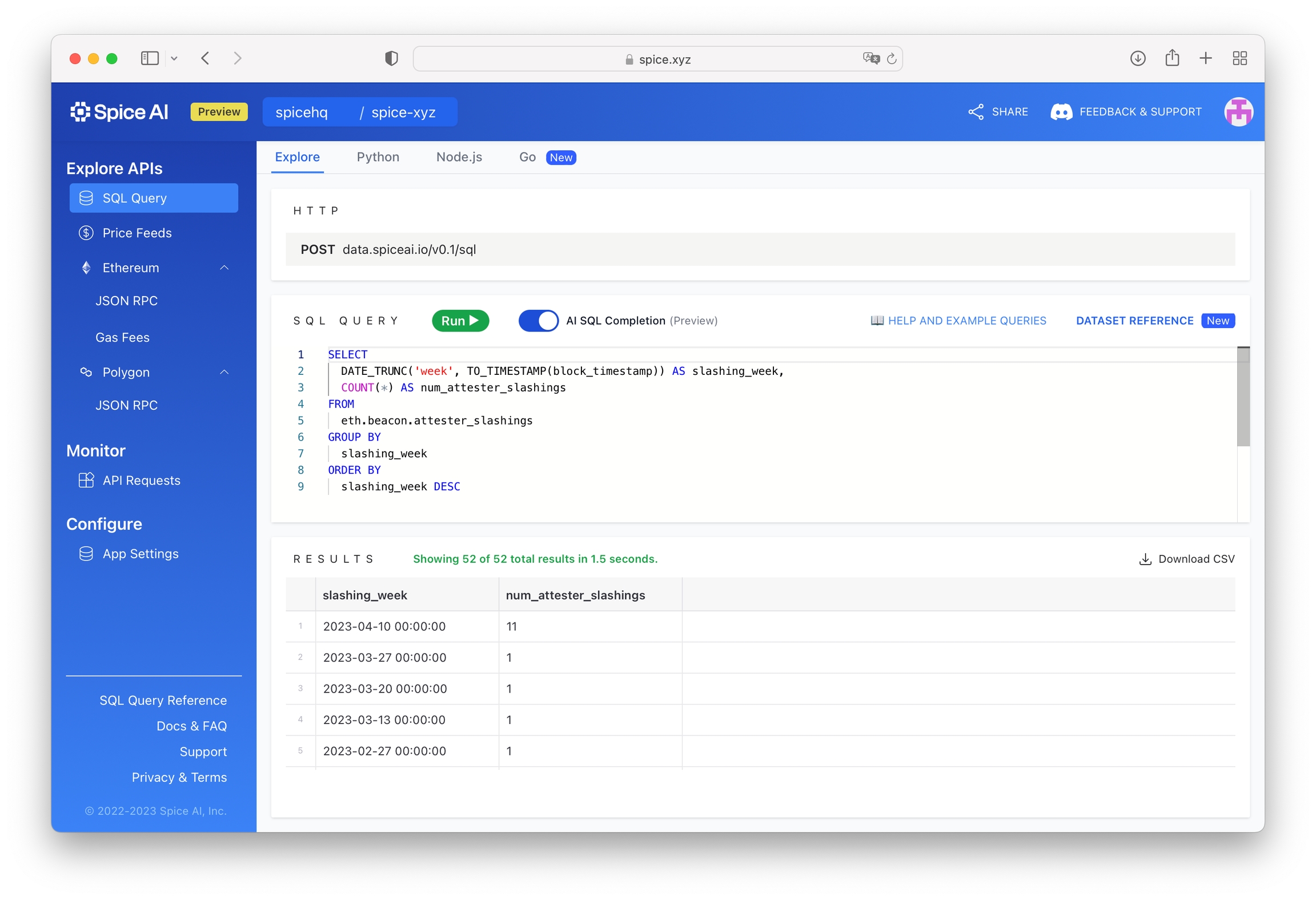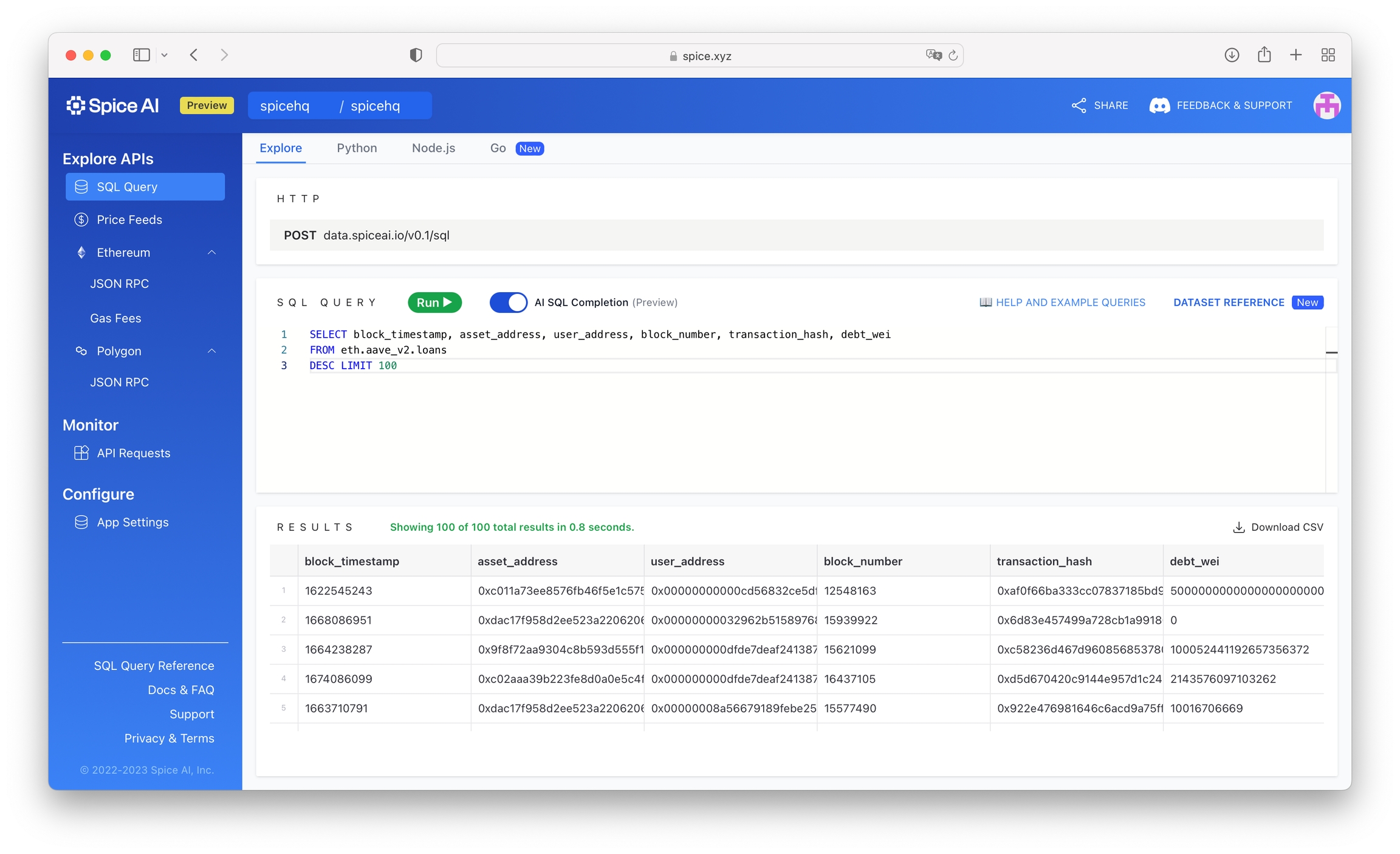 Spice supports querying Polygon data in addition to the existing Ethereum and BItcoin datasets.